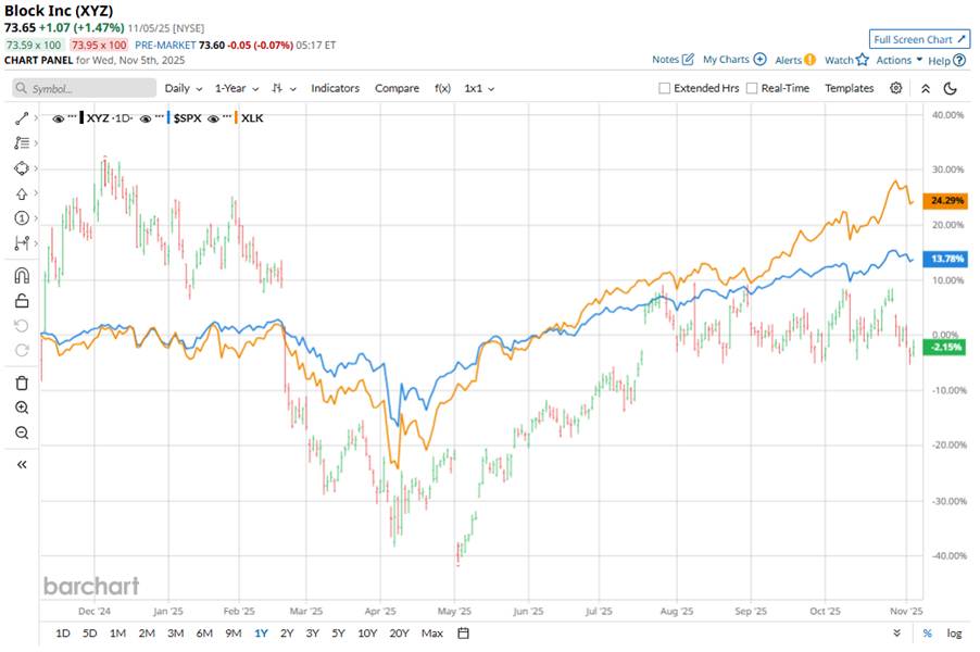 Shares of Block have significantly underperformed the broader market. XYZ stock has plunged 13.3% on a year-to-date (YTD) basis and increased 1.8% over the past 52 weeks, lagging behind the S&P 500 Index’s ($SPX) 15.6% surge in 2025 and 17.5% gains over the past year.