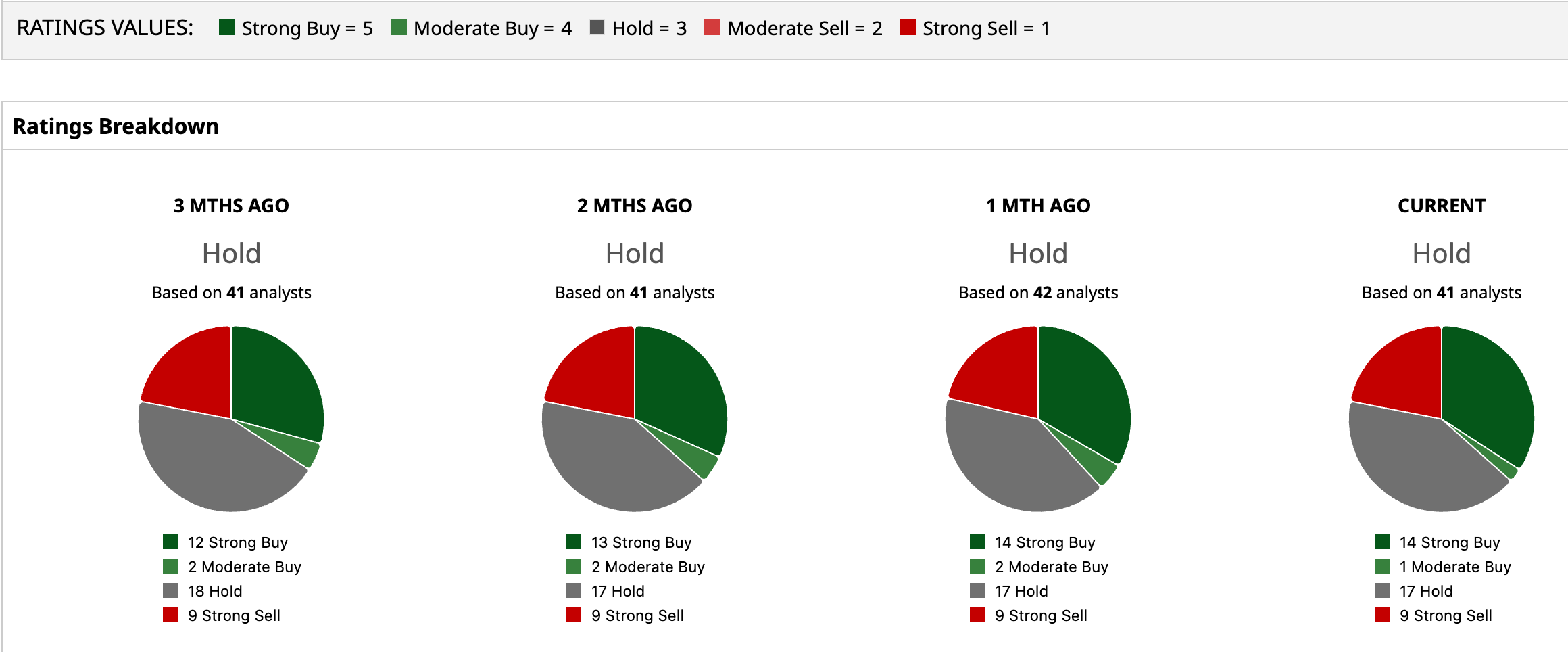 Right now, Wall Street isn’t exactly aligned on Tesla’s next chapter. The stock carries a consensus “Hold” rating, underscoring just how divided analysts are. Among the 41 analysts covering TSLA, 14 rate it a “Strong Buy,” one calls it a “Moderate Buy,” 17 are sitting on the sidelines with a “Hold,” and nine have gone all the way to a “Strong Sell.”