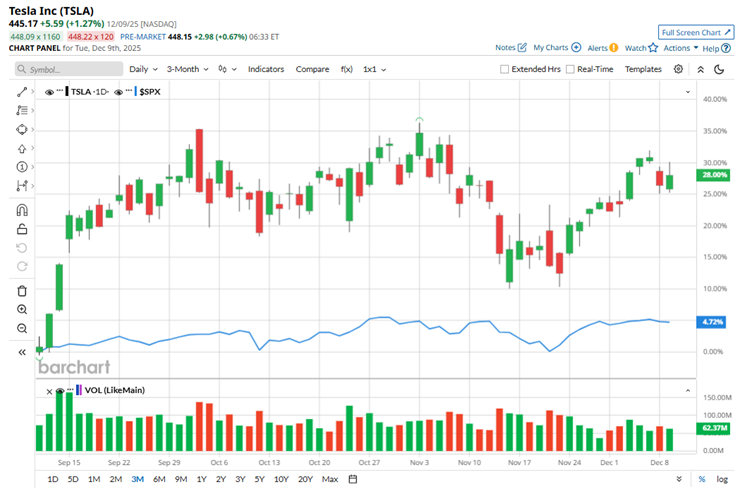 The stock is up an impressive 31.04% over the last three months alone, far outperforming the broader S&P 500 Index's ($SPX) 5.5% gain during the same stretch. In fact, TSLA stock is down only 7.52% from its 52-week high of $488.54, reached in December 2024.