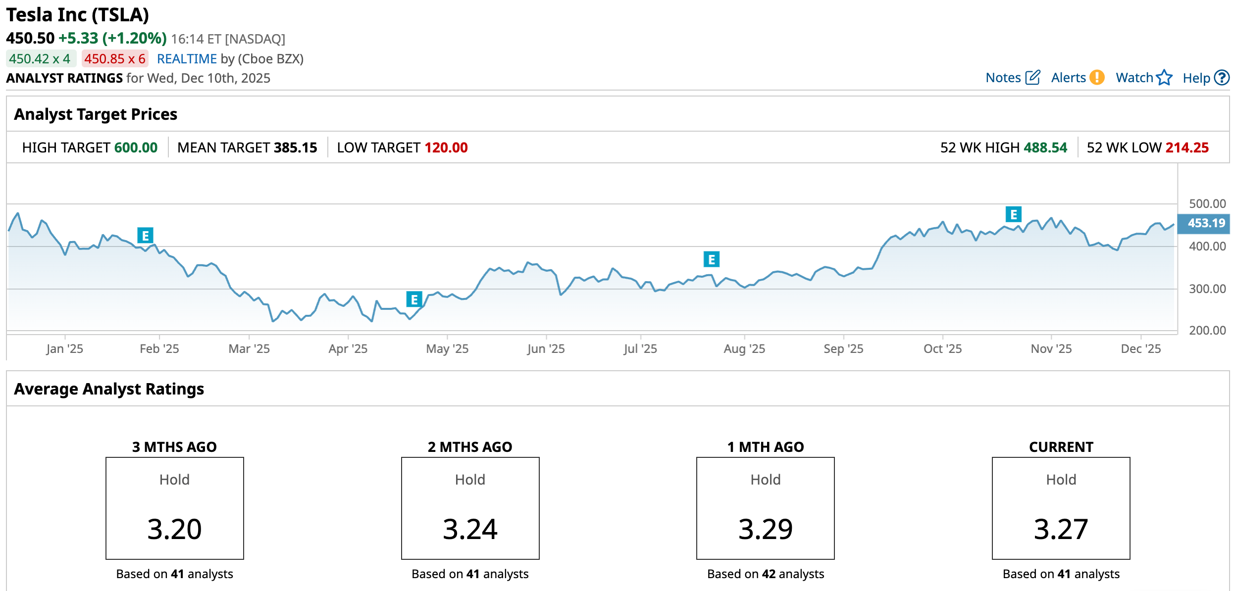 Tesla is already trading above its average price target of $385.15, but that doesn’t mean the upside story is over. The most bullish voices on the Street still think shares could reach $600, implying about 33.2% upside if the company can execute on its ambitious vision.
