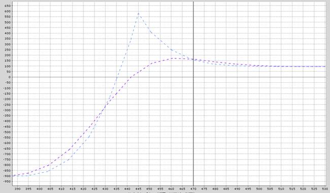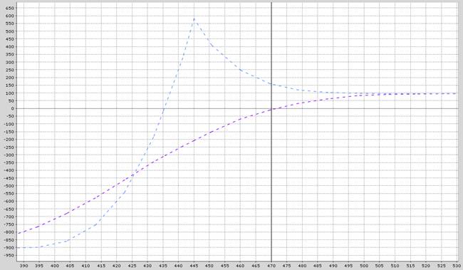 Below is the payoff graph with the blue line representing the profit or loss at expiration and the purple line being the trade as of today.