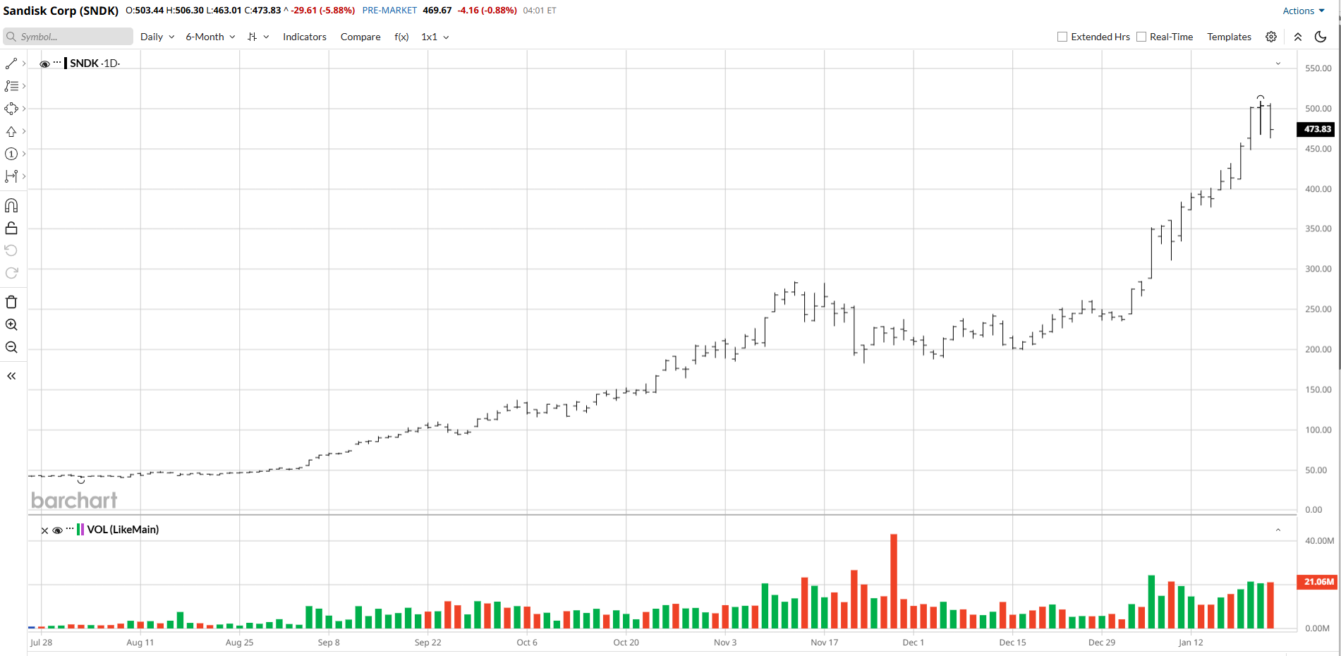Although SNDK stock has generally performed very well since its spinoff, the shares were down meaningfully between Nov. 12, 2025, and the end of 2025. Between Jan. 2 and Jan. 23, however, the name soared 100%. During the same period, the IWM advanced by 7.6%. And tellingly, on Jan. 23, the IWM dropped 1.85%, while SNDK stock sank 5.88%.