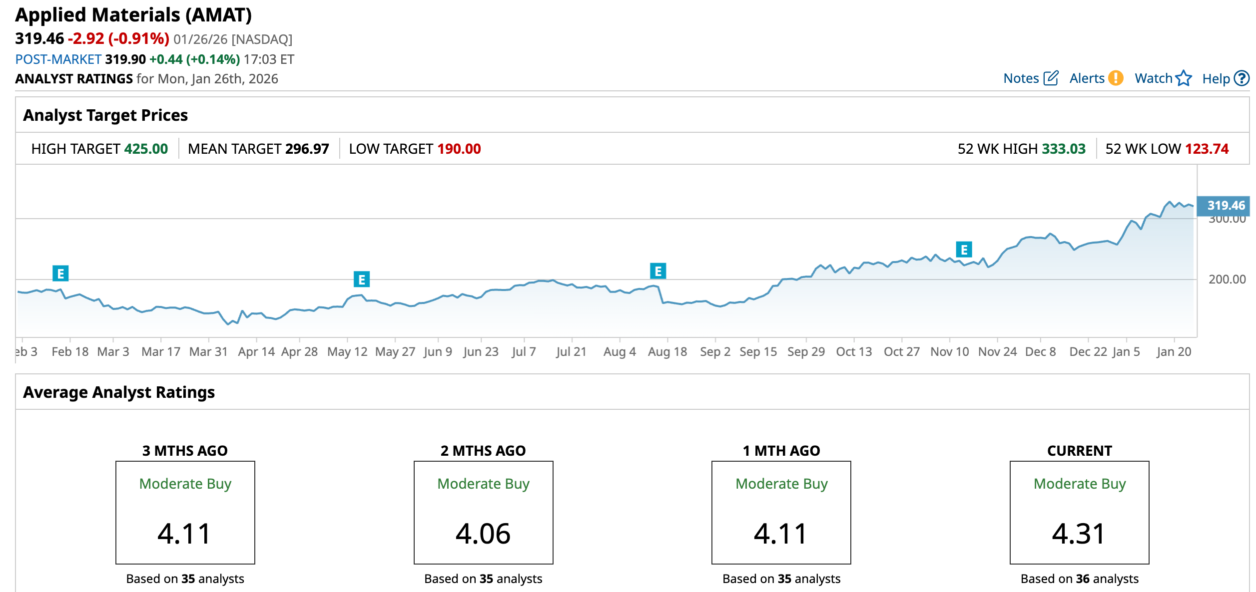 Out of the 36 analysts covering AMAT stock, 22 recommend “Strong Buy”, three recommend “Moderate Buy,” and 11 recommend “Hold”. The average AMAT stock price target is $296.97.