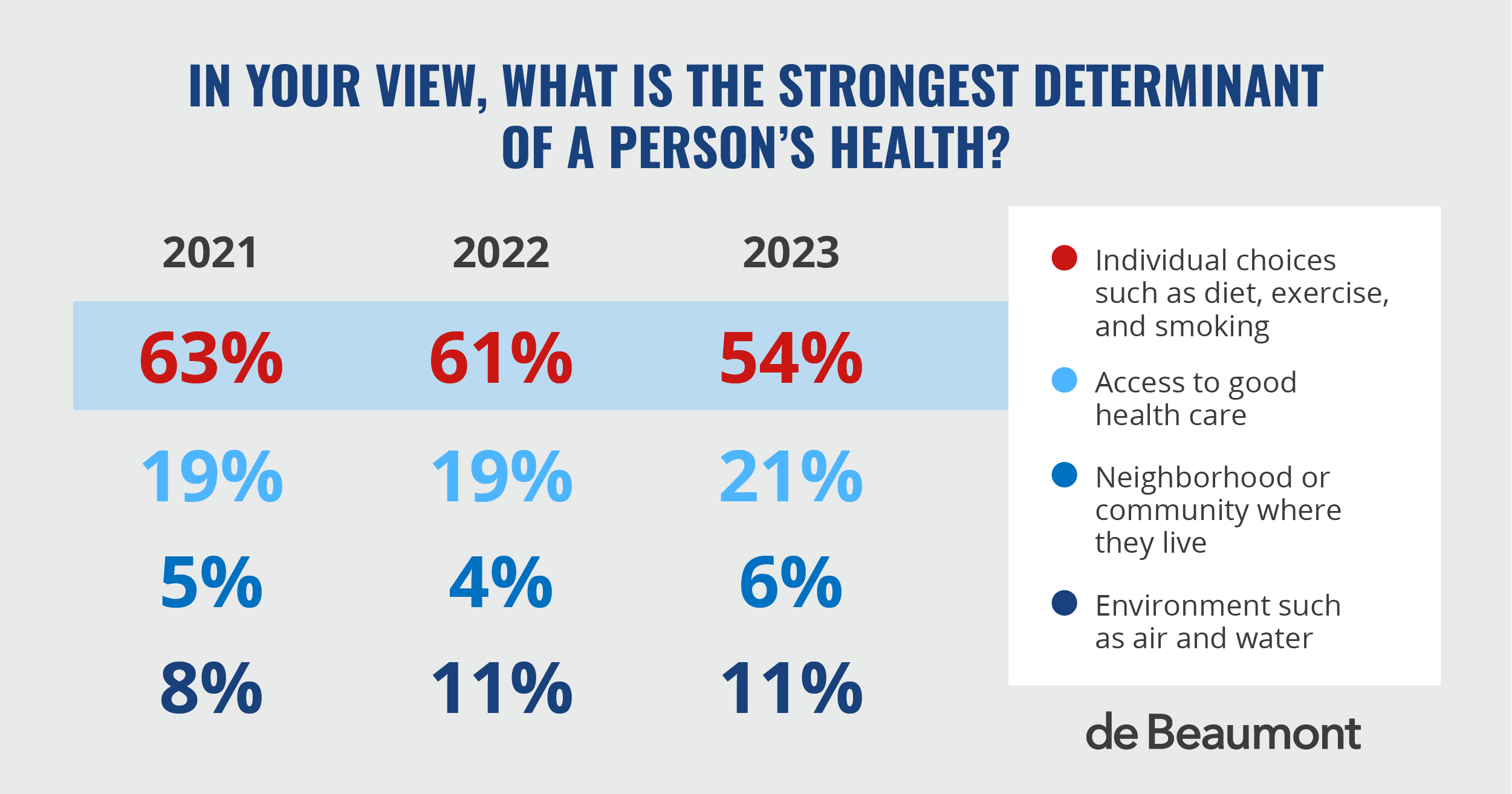 Increasingly, Americans are recognizing the effects of community-level influences on people’s individual health, the poll results show. These influences include factors like access to good health care services, environmental characteristics like clean air and water, and the neighborhood where a person lives. Between 2021 and 2023, the proportion of respondents who said individual health behavior choices were the strongest determinant of a person’s health decreased from 63% to 54%.