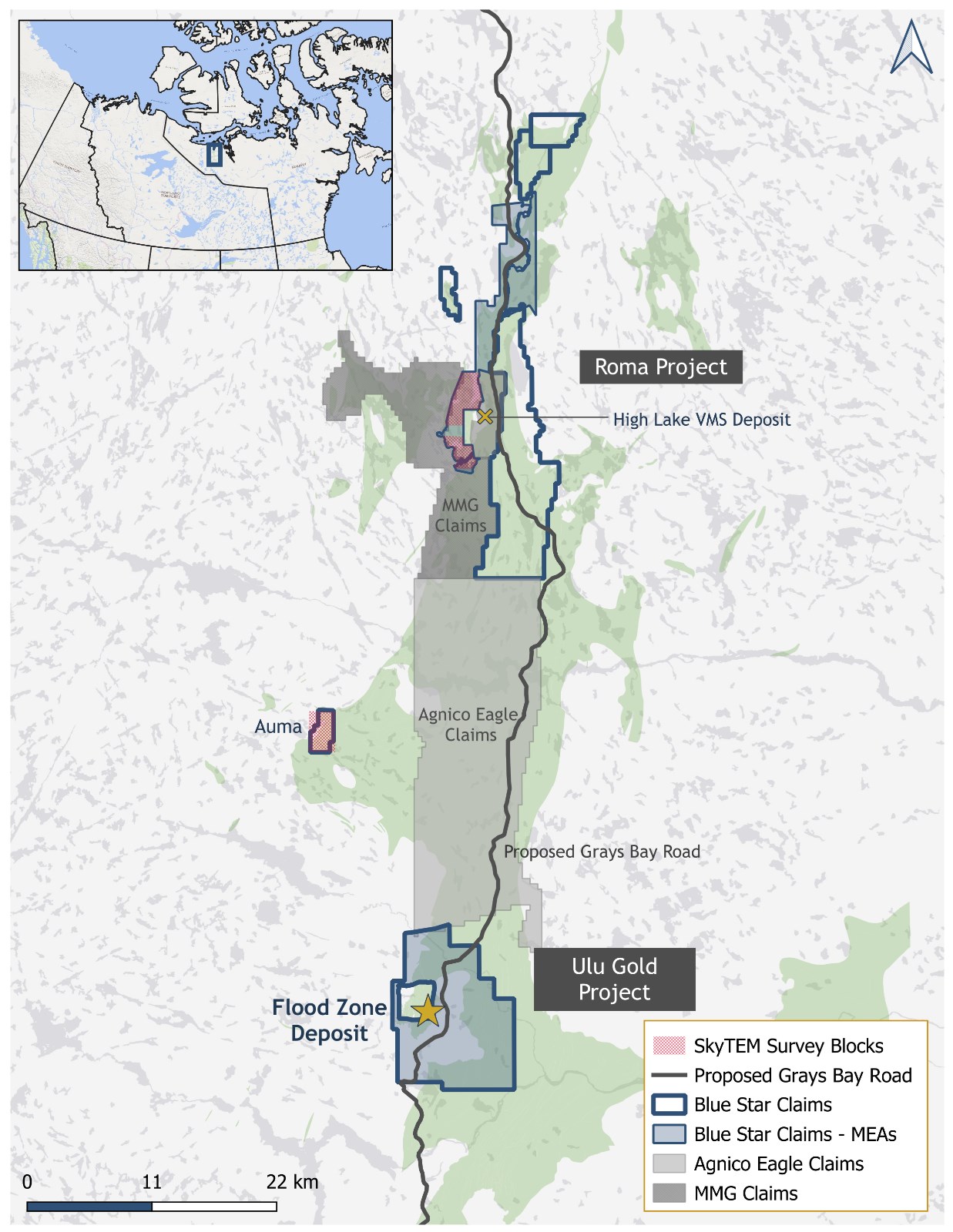 Blue Star is a mineral exploration and development company focused in Nunavut, Canada. Blue Star's landholdings total 300 square kilometres of highly prospective and underexplored mineral properties in the High Lake Greenstone Belt. The Company owns the Ulu Gold Project, comprised of the Ulu Mining Lease and Hood River Property, and the Roma Project. A significant high-grade gold resource exists at the Flood Zone deposit (Ulu Mining Lease), and numerous high-potential exploration targets (gold and critical minerals) occur throughout the Company's extensive landholdings, providing Blue Star with excellent resource growth potential. The site of the future deep-water port at Grays Bay is 40 - 100 km to the north of the properties, and the proposed route corridor for the all-weather Grays Bay Road passes close by the Roma and Ulu Gold Projects.