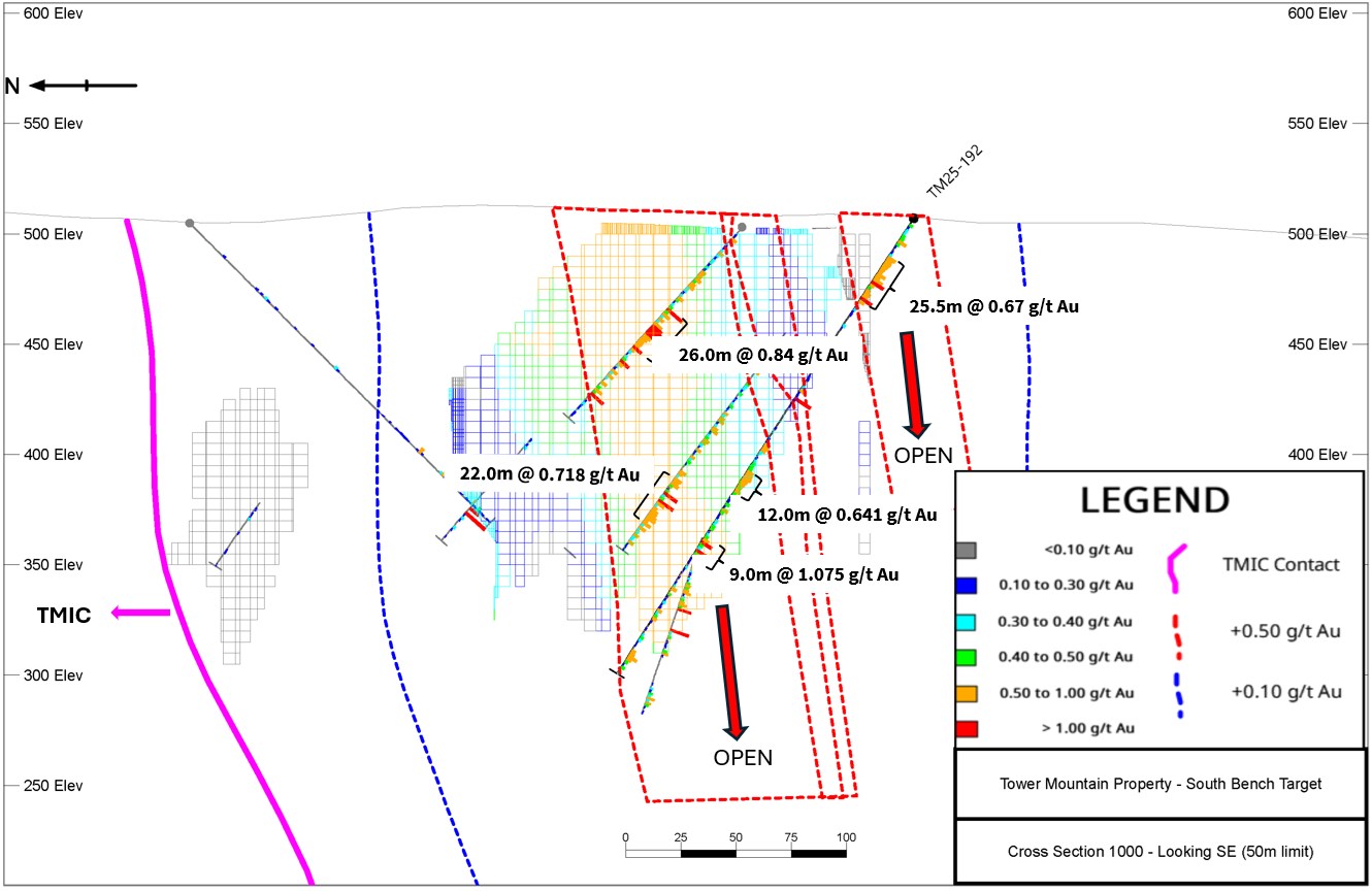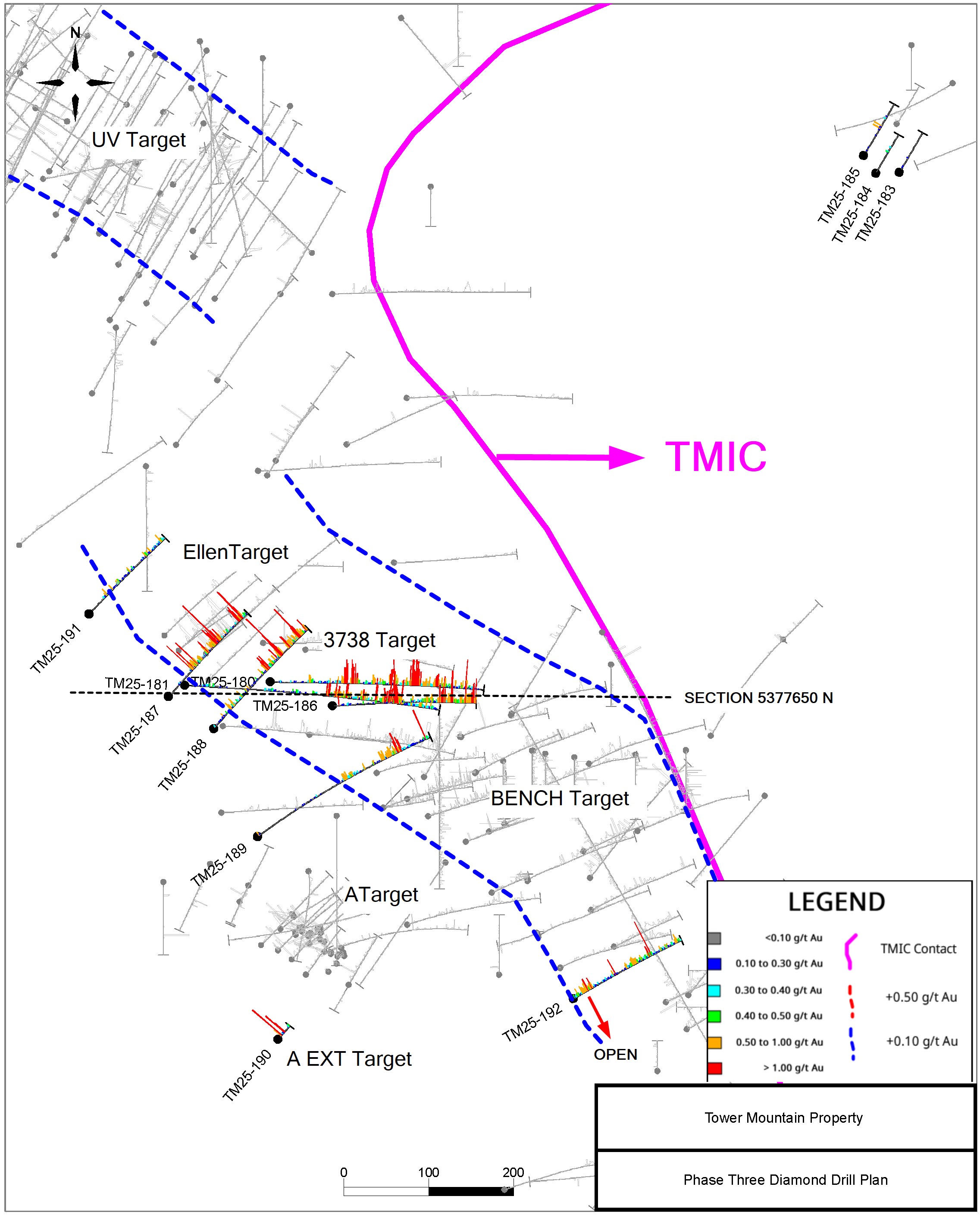 TM25-192, the final hole of Phase Three, was drilled at the south end of the Bench Target, approximately 25 metres south and 50 metres below hole TM11-82 (0.718 g/t Au over 22.0 metres), targeting another gap in the Company's exploration model. TM25-192 intersected 0.641 g/t Au over 12.0 metres vertically below the TM11-82 intersection. It also intersected 0.666 g/t Au over 25.5 metres near surface, a previously unrecognized zone of mineralization that is open to the southeast and down-dip. (Reference Figures 1.0 & 3.0).