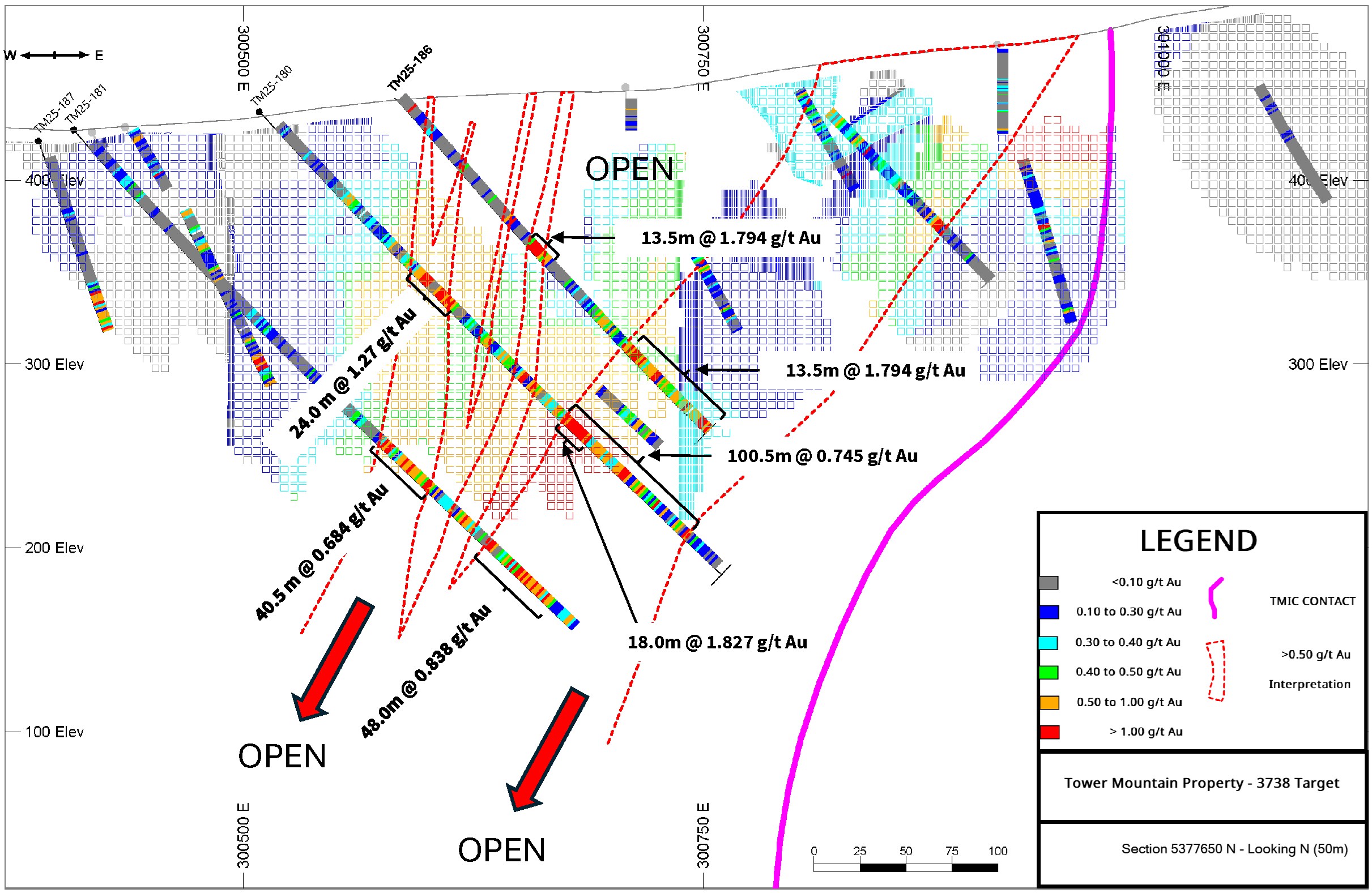 At the 3738-Target, drilling expanded the mineralized footprint with all seven (7) holes returning significant intercepts. Standout results include: 1.83 g/t Au over 18.0 metres within 0.47 g/t Au over 333.0 metres (TM25-180 extension), 0.53 g/t Au over 181.5 metres (TM25-181 extension), 1.05 g/t Au over 25.5 metres (TM25-186), 1.98 g/t Au over 13.5 metres (TM25-187), 0.42 g/t over 271.5 metres (TM25-188), 0.698 g/t Au over 37.5 metres (TM25-189).