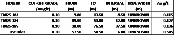 Three (3) holes, (249 metres) were completed at the H-Target, 25 metres east, west and below hole TM25-182 (Phase Two) that intersected 0.73 g/t Au over 6.0 metres. All three holes intersected mineralization above a 0.10 g/t Au cut-off grade. TM25-185, 25 metres northwest of TM25-182, intersected 0.505 g/t Au over 6.00 metres suggesting a relative flat lying target.