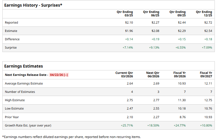 The company is scheduled to announce its fiscal 2026 second-quarter earnings soon. Ahead of this event, analysts expect this tech company to report a profit of $2.64 per share, up 25.7% from $2.10 per share in the year-ago quarter. The company has surpassed Wall Street’s bottom-line estimates in each of the last four quarters.