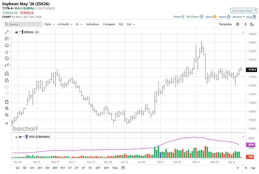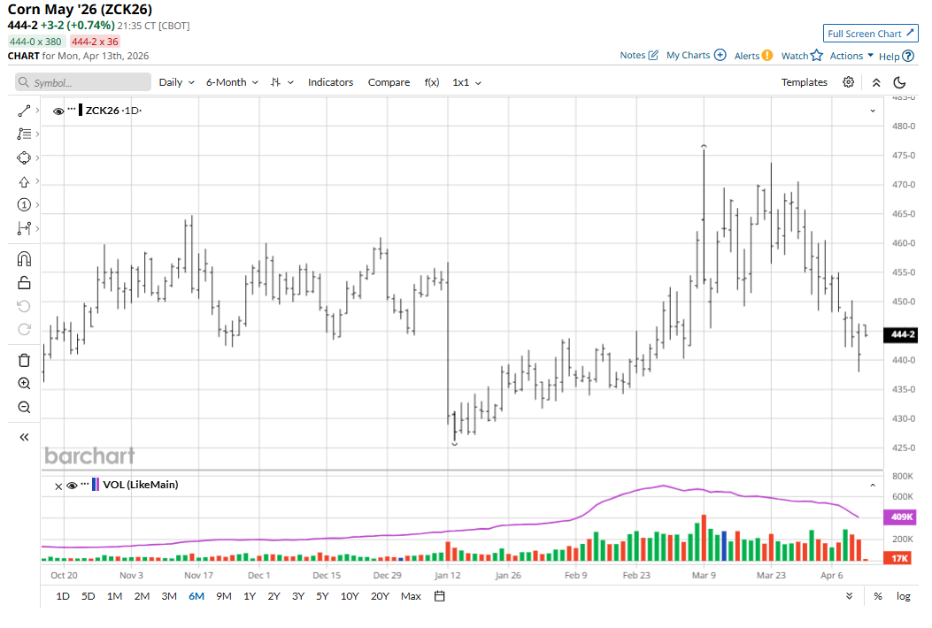 May corn (ZCK26) futures on Friday fell 3 cents to $4.41 and hit a six-week low. For the week, May corn was down 11 1/4 cents. May corn on Friday saw a technically bearish weekly low close to suggest more chart-based selling pressure from the speculators early this week.