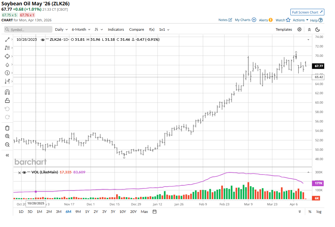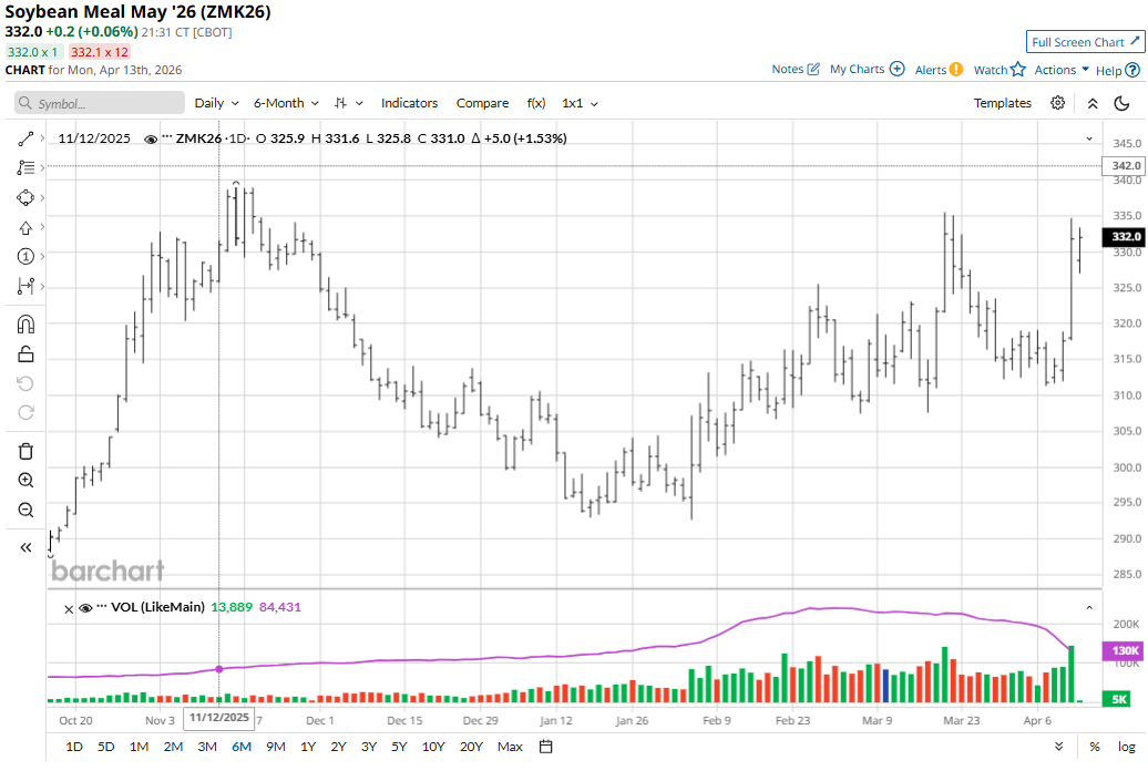 The soybean meal futures (ZMK26) market on Friday was the star performer of the grains complex, posting the largest daily gain in months. May soybean meal soared $14.20 a ton to $331.80, hit a three-week high, and for the week was up $16.60. May soybean (ZSK26) futures on Friday rose 10 1/2 cents to $11.75 3/4, closed at a nearly four-week high close, and for the week were up 12 1/4 cents. May soybean oil (ZLK26) futures on Friday lost 61 points to 67.09 cents and for the week were down 185 points. Spreaders were featured unwinding long bean oil, short meal spreads late last week.
