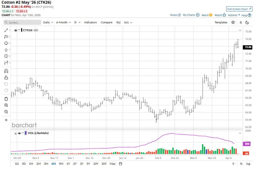 May cotton (CTK26) futures on Friday fell 4 points to 73.22 cents on some mild profit taking after hitting a 12-month high early in the session. For the week, May cotton was up 230 points.