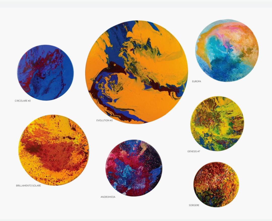 The artist’s work, circular in form and radiant in color, evokes the infinite orbits of planets and the timeless depths of the universe.