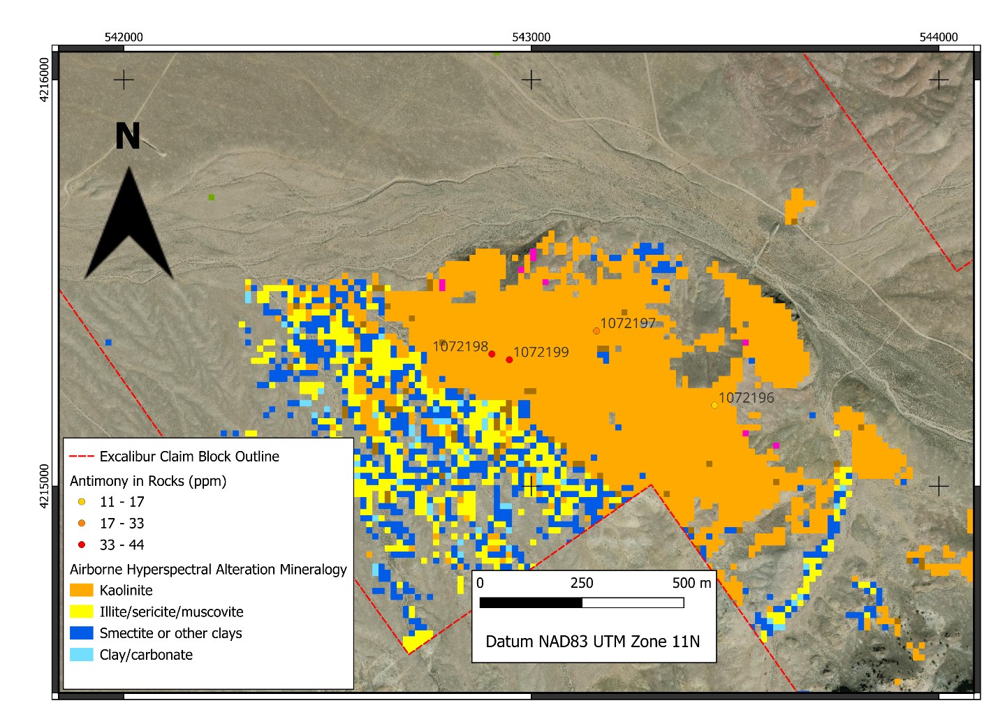 Vancouver, British Columbia--(Newsfile Corp. - April 16, 2026) - Excalibur Metals Corp. (TSXV: EXCL) ("Excalibur" or the "Company") is pleased to announce significant results at its developing Northwest Rangefront Target ("Rangefront") at the Bellehelen Silver-Gold Project (the "Project" or "Bellehelen"), Nye County, Nevada. Following compelling initial rock chip sampling that identified a large-scale pathfinder element anomaly within a broad alteration zone (see Figure 1 below), the Company has completed a systematic soil grid at Rangefront consisting of approximately 300 samples (results pending). This survey covers the multi-kilometer alteration anomaly defined by airborne remote sensing. Concurrently, this week the Company mobilized a geophysics crew to conduct a high-resolution CSAMT survey for drill targeting later in 2026. In addition to the work being carried out at Rangefront, Excalibur is also finalizing drill preparations at the Spyglass Ridge Target ("Spyglass") located approximately 8km southeast of Rangefront with drilling expected to commence next week.