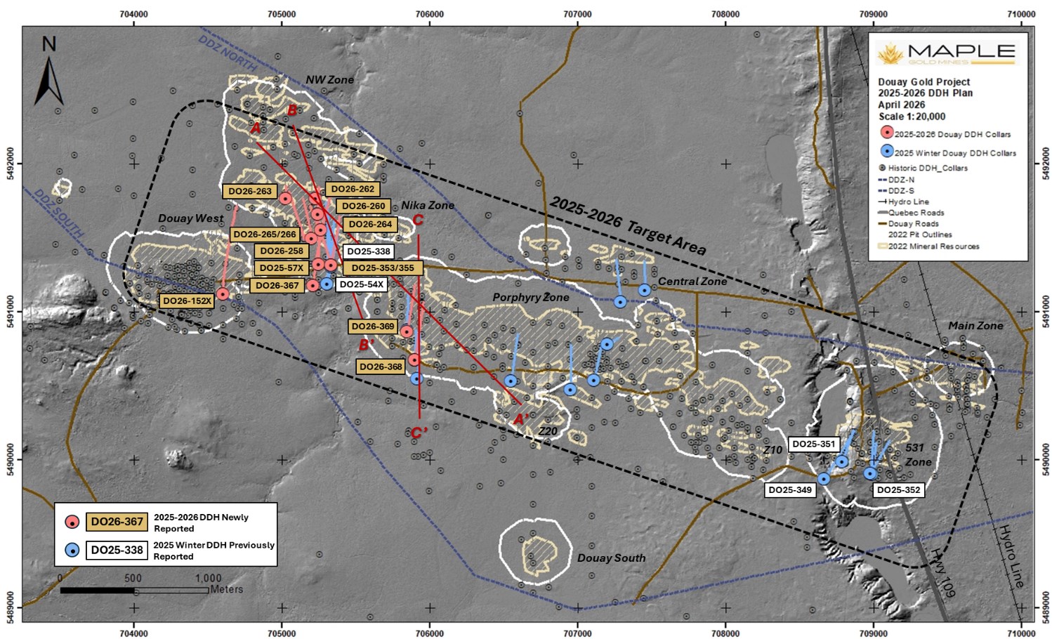 Vancouver, British Columbia--(Newsfile Corp. - April 16, 2026) - Maple Gold Mines Ltd. (TSXV: MGM) (OTCQX: MGMLF) (FSE: M3G0) ("Maple Gold" or the "Company") today announced assay results from 14 drill holes completed during its ongoing, fully-funded 30,000-metre ("m") winter drill campaign (the "Program") at its 100%-owned Douay Gold Project ("Douay") and Joutel Gold Project ("Joutel") (together, "Douay/Joutel" or the "Property") located along the Casa Beradi-Douay Gold Trend in Québec, Canada. Results include 12 drill holes from the Nika Zone and two (2) drill holes from the Porphyry West Zone, targeting higher-grade southeast-plunging shoots to confirm continuity and extend mineralization at depth following encouraging results from the 2025 winter program.
