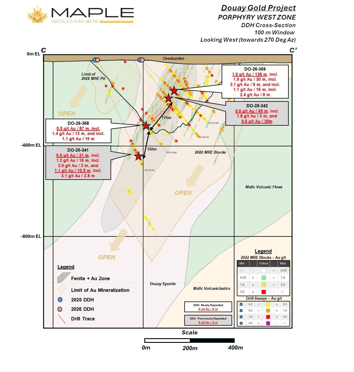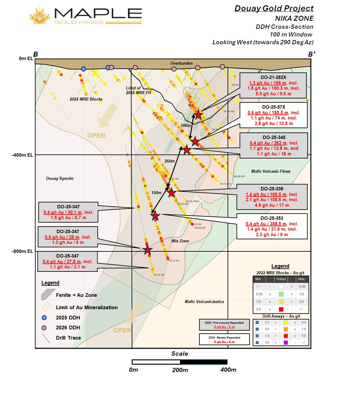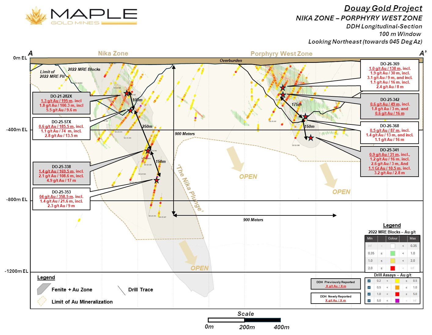 "These results validate the continuity and similarity of higher-grade plunging shoots within the Nika and Porphyry West zones, while successfully extending bulk tonnage gold mineralization to depth," stated Ian Cunningham-Dunlop, P.Eng., Executive Vice President of Maple Gold. "With the largest drill program in the Company's history nearing completion, our team is now in the planning phase for even more aggressive fully funded drill programs in H2 2026 and 2027 that will target near-term resource expansion opportunities at Douay/Joutel and the significant district-scale growth potential we see across the broader Property."
